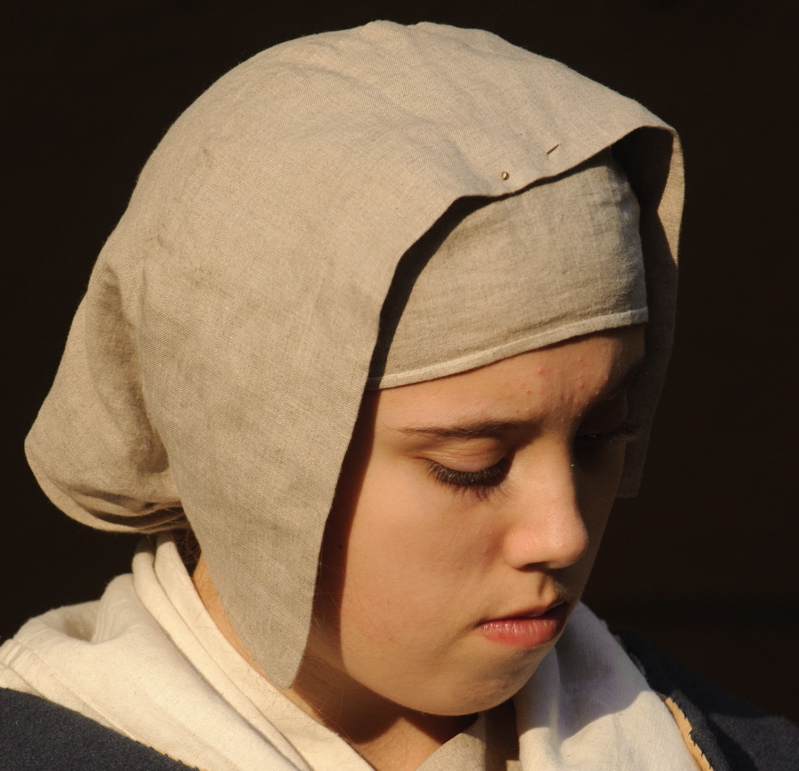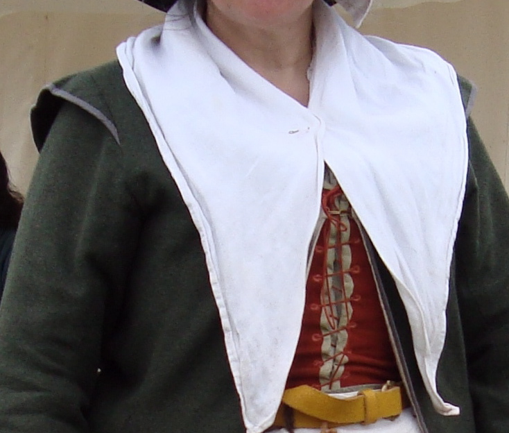 A KERCHIEF was worn around neck and shoulders. In its simplest form, it was a square of unbleached linen or hemp folded diagonally, with the underside slightly longer and fastened with brass pins at the front. The ends are shown sometimes tucked into bodice fronts in paintings. It preserved modesty, protected the back of your neck from sunburn and, on cold days, kept your chest warm.