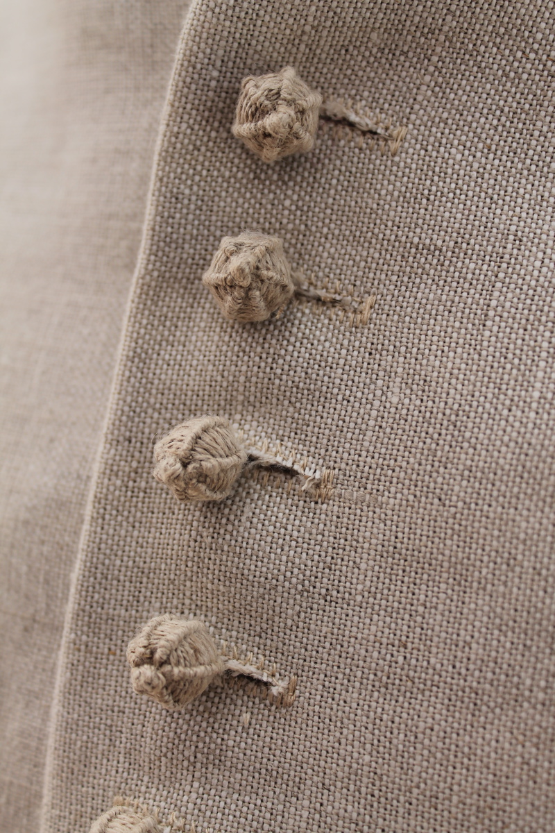 as we can tell, in no way uniform in cut or colour, even for regimental issues. The simplest style is a square loose-fitting garment with body and tabs cut in one piece, though there are many variations possible-shoulder wings and curved tabs for instance. They could be lined, depending on how much money a Colonel was prepared to spend on clothes. Coats were fastened down the front with several closely spaced buttons, a dozen at least on a soldier’s coat. Pewter or cloth buttons were used, and were usually spherical, although it’s thought that some issue coats had flat buttons. They shouldn’t be pierced through like modern buttons but fixed to a single stalk or shank. Cloth buttons are more comfortable on a soldier’s coat if you are going to wear armour.
